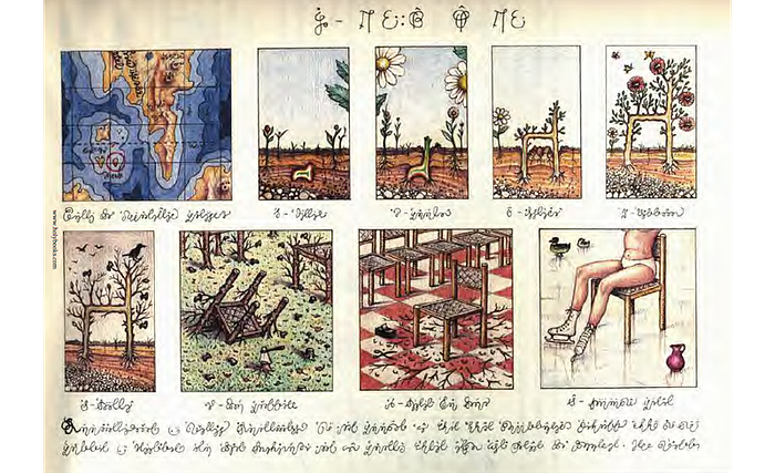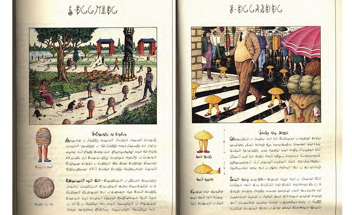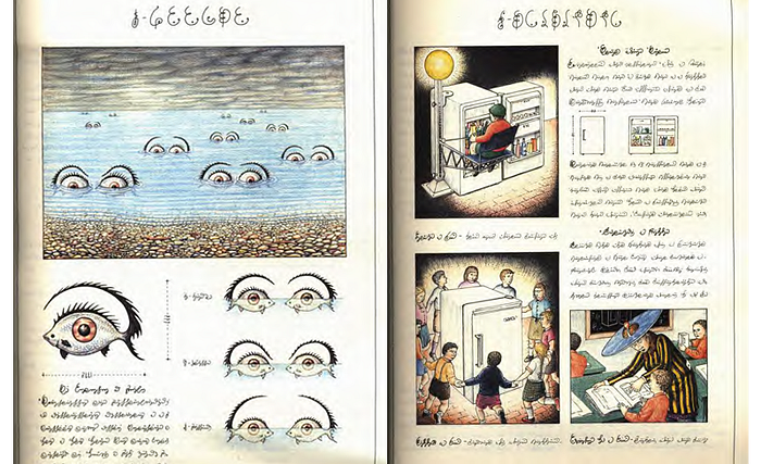 Kitabımız Codex Seraphiniaus. 1981 yılında yayınlanan Codex Seraphiniaus İtalyan sanatçı, mimar ve endüstriyel tasarımcı Luigi Serafani tarafından 30 ayda (1976–1978) yaratılmış hayali bir dünyanın ansiklopedisidir. Kitap ortalama 360 sayfadır ve kurmaca bir dilde, şifrelenmiş bir alfabede yazılmıştır. El yazması bu ansiklopedik kitapta çok sayıda elle çizilip kuru boya ile renklendirilmiş, garip ve olağanüstü flora, fauna, anatomi, moda ve yiyecek resimleri bulunur.