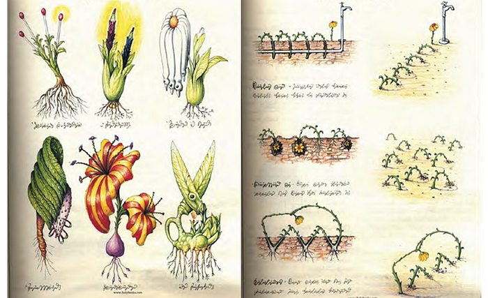 Bazı açılardan hayvanlara bazı açılardan bitkilere benzeyen birleşmiş canlılar bulunmaktadır çizimlerde.