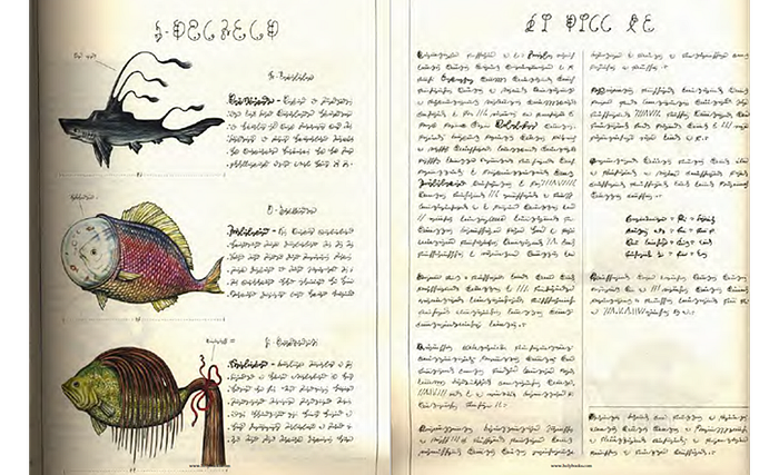 Kitabın yazıldığı dil üzerine araştırmalar olmasına rağmen tam bir netlik hala kazanılmamıştır. Yazar yazdığı yazıyı asla açıklamamış ve incelenmesine de tamamıyla karşıdır. Bununla birlikte, sayfaların numaralandırılması için kullanılan sayı sistemi Allan C. Wechsler ve Bulgar dilbilimci Ivan Derzhanski tarafından kırılmıştır (bağımsız olarak). Bu sistem, 21’lik sayı sisteminin bir varyasyonudur. Yazar insanların kitaba baktığında, okuma yazma bilmeyen çocukların yetişkin kitabı kurcaladığındaki hissi yakalamalarını istediğini söylemiştir. Kitap her konuya yer veren bir ansiklopedi şeklinde yazılmış olmasına rağmen açıkça görünen 2 bölümden oluşur. İlk bölüm çiçek, bitki, hayvan gibi doğaya ait konular içerirken ikinci bölüm mimari, moda, endüstri gibi daha çok beşeri ilimleri içerir.